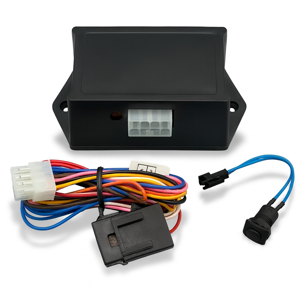 کیت کامل: این سیستم شامل یک یونیت کنترل مرکزی (مغز فرمان)، یک دسته سیم استاندارد و کامل و یک کلید دکمهای زیبا برای نصب داخل کابین است.